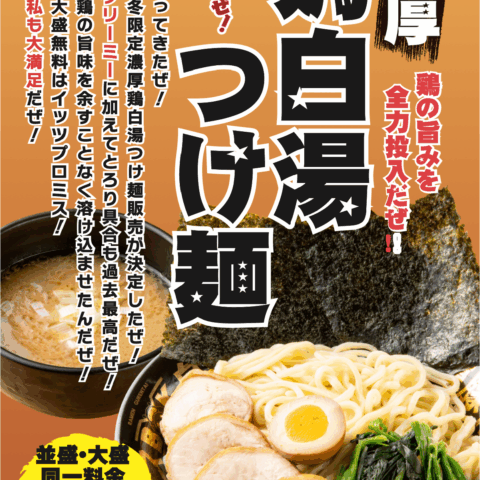 お待たせしたぜ!今年もヤツが帰ってきたぜ!冬期限定の濃厚鶏白湯つけ麺販売が決定したぜ!!例年以上に濃厚×クリーミーに加えてとろり具合も過去最強だぜ!なぜなら、鶏の旨味を余すことなく溶け込ませたんだぜ!!今回はスープにも鶏 […]