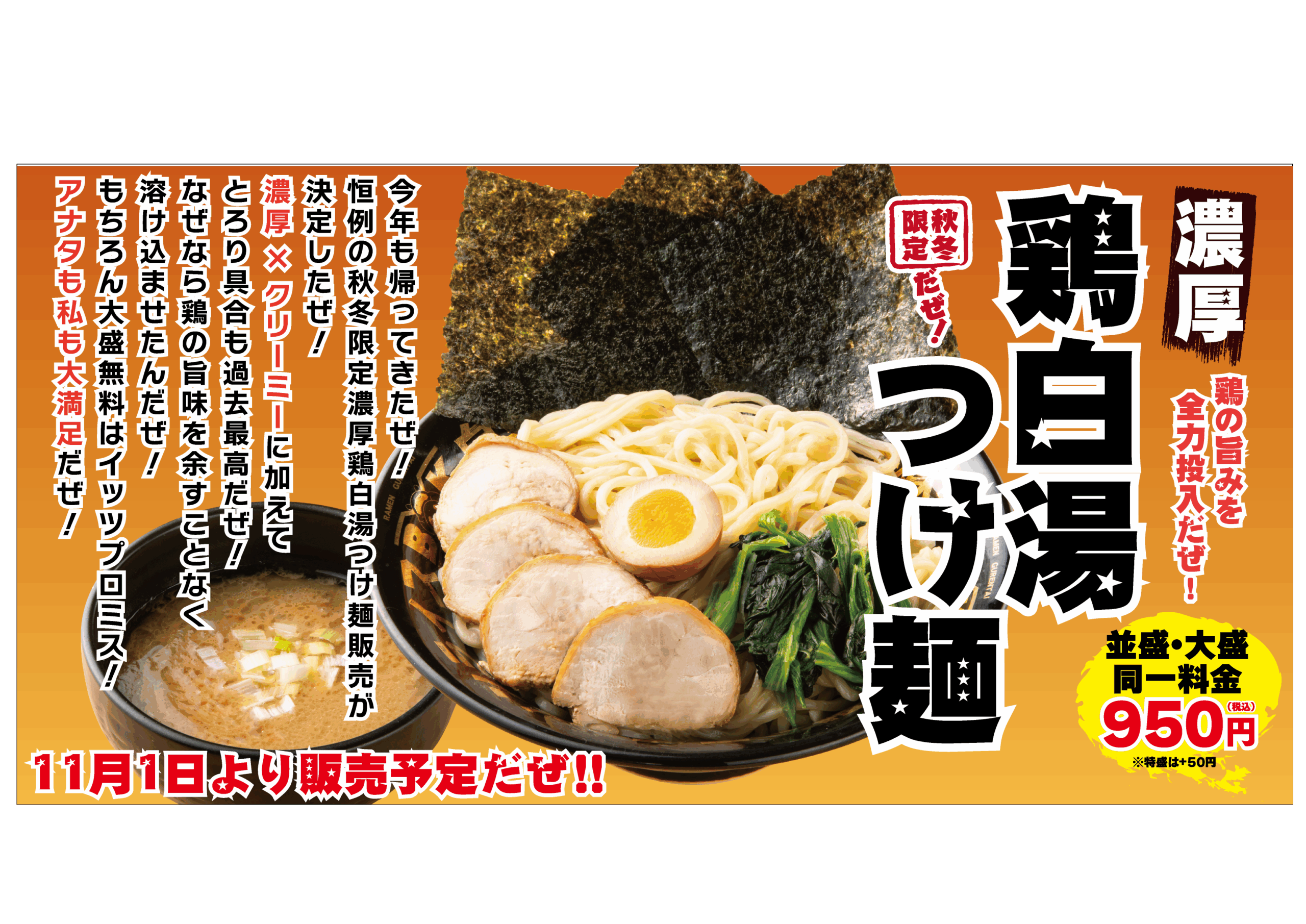 ■本文お待たせしたぜ!今年もヤツが帰ってきたぜ!冬期限定の濃厚鶏白湯つけ麺販売が決定したぜ!!例年以上に濃厚×クリーミーに加えてとろり具合も過去最強だぜ!なぜなら、鶏の旨味を余すことなく溶け込ませたんだぜ!!今回はスープ […]