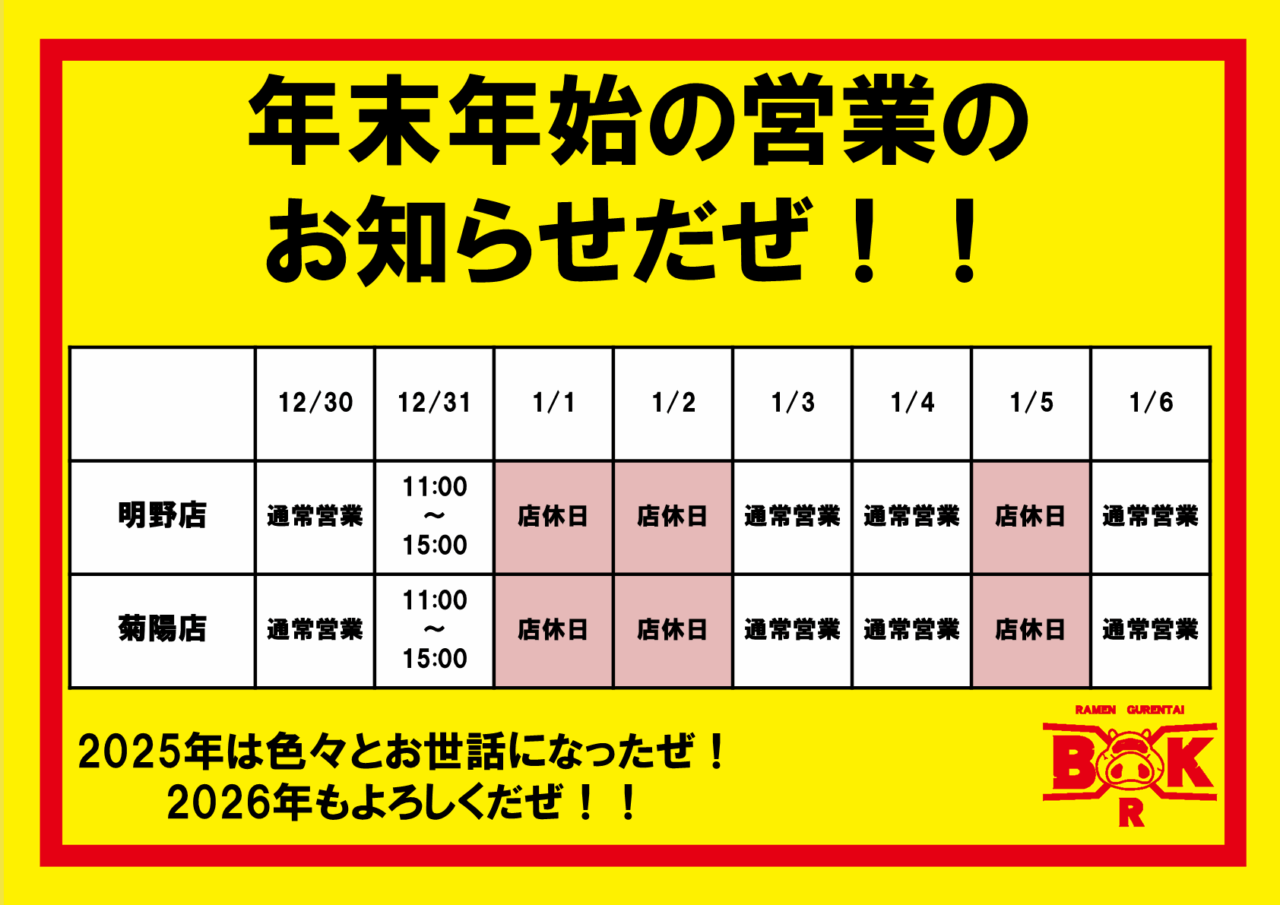 年末年始の営業のお知らせ
